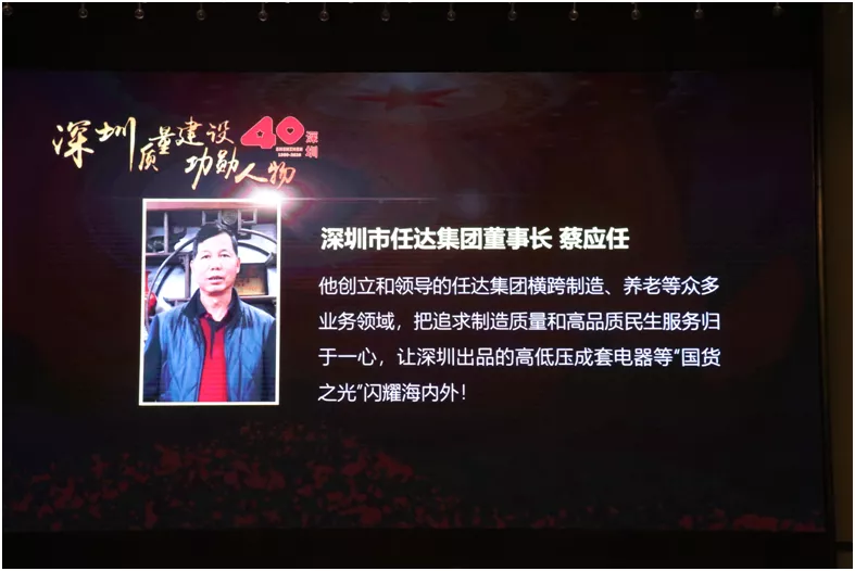 深圳市任達集團董事長蔡應任先生作為此次榮列“功勛人物”“杰出質量人”榜單的企業家之一,其在深圳質量建設中的努力得到了高度認可。主辦方在其頒獎詞中贊揚道:他創立和領導的任達集團橫跨制造、養老等眾多業務領域,把追求制造質量和高品質民生服務歸于一心,讓深圳出品的高低壓成套電器等“國貨之光”閃耀海內外!